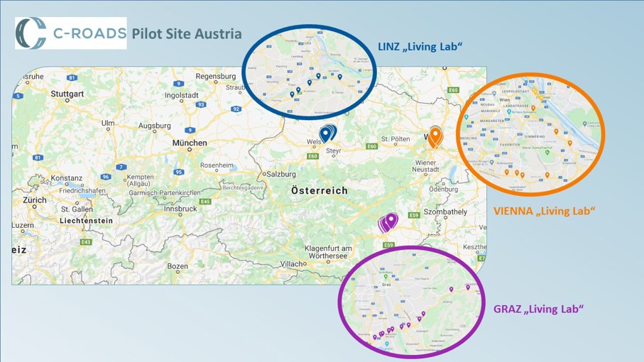 The Austrian pilot sites encompass selected areas of heavily frequented national motorway networks. This includes the Vienna city motorway A23 and the adjacent surrounding motorway sections. The site stretches from Vienna to Salzburg and includes the area near to Linz as well. Other parts of the motorway network near to the cities of Innsbruck in western and Graz in southern Austria are as well part of the three TEN-T road corridors.