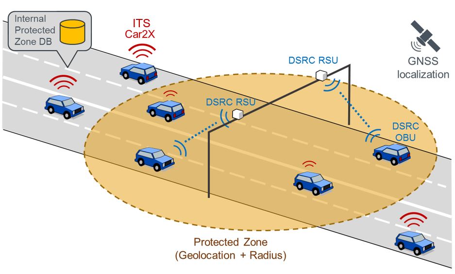 In order to avoid harmful interference to CEN DSRC tolling systems operating at 5.8 GHz, vehicle as well as roadside ITS stations need to activate interference mitigation techniques when being inside a "protected zone", which is a circular area around tolling equipment.