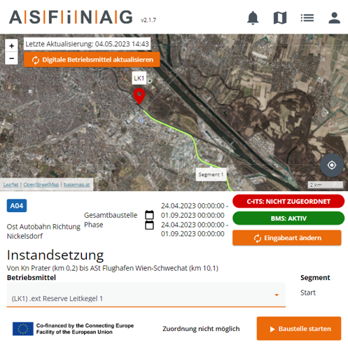 To make sure, that the GNSS data is accurate enough, a quality control step was implemented. With a web application (BBO app), workers can check the location visually and add an accurate starting point to a digital representation of the roadworks. It is important to mention, that employees can interact with the BBO app in a safe distance as the GNSS signal is sent out from the BBO devices, which are placed in the danger zone. Oncen the roadworks is completed, the staff on-site can end the roadworks with the app, or the system detects the end of the roadworks automatically with a deviation in the GNSS data once the sender is replaced. This ensures data quality and exact message duration for sent messages.