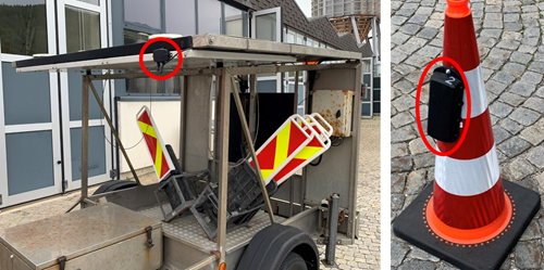 Basically, the BBO project includes GNSS devices mounted on cones or mobile safety trailers, as well as a tablet-optimized web application. The GNSS information is used by the C-ITS backend to create the message which is later transmitted by relevant RSUs. The GNSS mounted equipment (BBO devices) is placed the same way as in every roadworks and sends its position periodically without user intervention.